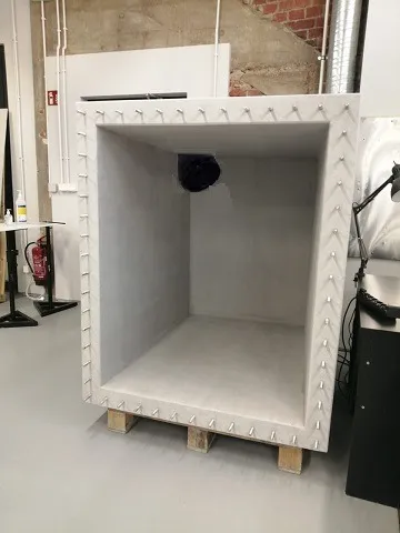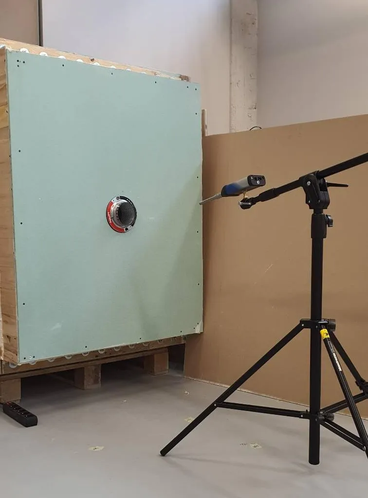 Po otrzymaniu od klienta modelu przelotu oraz określeniu wytycznych, przystąpiliśmy do pomiarów akustycznych. Badania przeprowadzono na stanowisku laboratoryjnym do pomiarów izolacyjności akustycznej oraz tłumienia wtrącenia w polu rozproszonym. Jest to najbardziej wymagające środowisko testowe dla przegród, z uwagi na fakt, że fala akustyczna pada na przegrodę pod dowolnym kątem (Rys. 1).