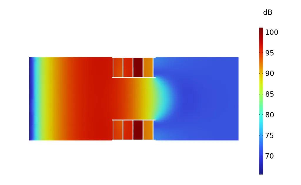 Przykładowy rozkład poziomu ciśnienia akustycznego uzyskany w symulacjach numerycznych przed i za tłumikiem dla częstotliwości 1000 Hz przedstawiono na Rys. 4.