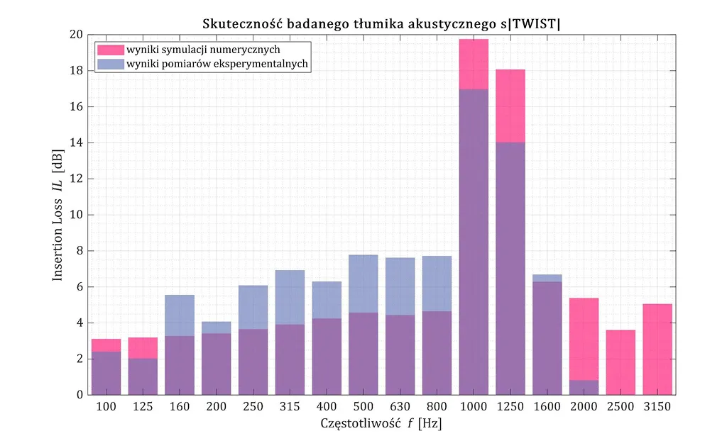 Rys. 5 Wyniki symulacji i pomiarów eksperymentalnych tłumienia wtrącenia (Insertion Loss IL [dB]) dla analizowanego tłumika akustycznego.