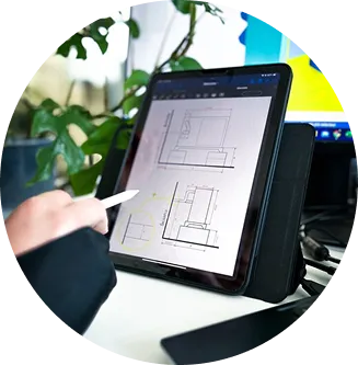 Inżynier Silencions pracujący w programie nad projektem obudowy na pompę ciepła; na ekranach laptopa i monitora widoczny model 3D oraz rysunek techniczny.