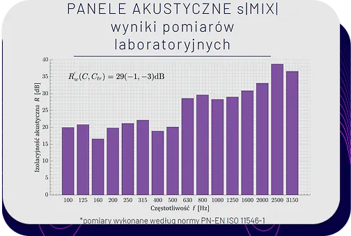 Skuteczność paneli s|MIX| opiera się na obiektywnych badaniach. Pomiary laboratoryjne( norma PN-EN ISO 11546-1) potwierdziły izolacyjność akustyczną na poziomie Rw (C,Ctr) = 29(−1,−3) dB.