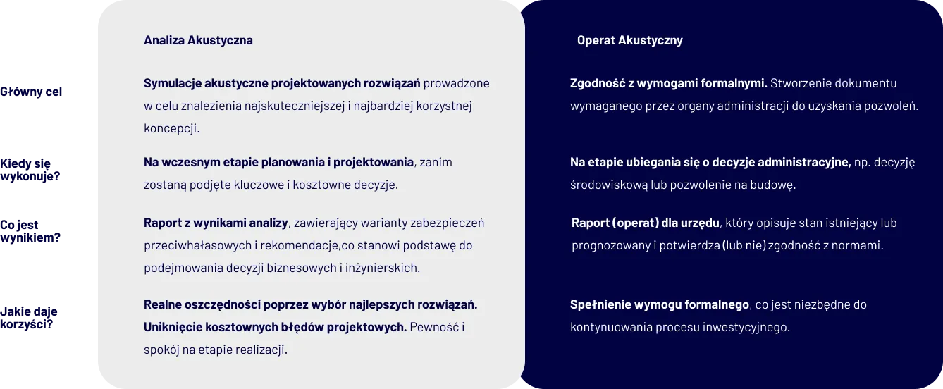 To kluczowa różnica. Analiza akustyczna to proaktywne narzędzie do optymalizacji projektu, które wykonuje się na wczesnym etapie, by testować warianty i oszczędzać pieniądze. Operat akustyczny to najczęściej dokument formalny, wymagany przez urzędy na etapie uzyskiwania pozwoleń, który opisuje stan prognozowany w celu weryfikacji zgodności z prawem. Nasza analiza często stanowi fundament dla późniejszego operatu.